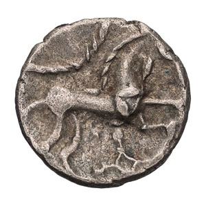 Celtic Britain, Iceni. Queen Boudicca. 61 AD. AR Unit, 1.27gg. (1h). Obv: Celticized head right, three dots below, two trefoils before face. Rx: Celticized horse right, elaborate wheel-like object above horse. Van Arsdell 792-1. This is no longer thought to be an issue with a portrait of Boudicca. EF.