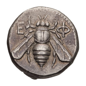 Ionia, Ephesus. Thrasymedes, magistrate. c. 370-360 BC. Tetradrachm, 15.31gg. (11h). Obv: Ε-Φ Bee with straight wings. Rx: Forepart of stag right, head turned back; palm tree to left, ΘΡΑΣΥΜΗΔΗΣ to right. Kinns, Pixodaros Hoard (CH IX), O51. SNG Kayhan-. SNG Copenhagen-. SNG Munchen-. Sotheby, 6 December 1907, lot 81 (same obverse die). These tetradrachms are very beautiful and highly desired by collectors. A coin this well centered is extremely desirable. Good EF.